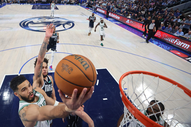 보스턴 셀틱스의 제이슨 테이텀이 13일(한국시간) 미국 텍사스주 댈러스의 아메리칸 에어라인스 센터에서 열린 2023-2024 미국프로농구(NBA) 챔피언 결정(7전 4승제) 3차전 댈러스 매버릭스와 경기에서 상대 수비를 뚫고 레이업슛을 시도하고 있다. 테이텀과 제일런 브라운이 61점을 합작한 보스턴이 106-99로 승리해 시리즈 전적 3연승을 기록했다. 보스턴은 이로써 NBA 18번째 정상 등극에 1승만을 남겨놓게 됐다. AFP연합뉴스