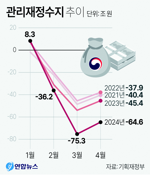 그러나 통합재정수지에서 국민연금 등 4대 보장성 기금 흑자 수지를 차감해 정부의 실질적인 재정 상태를 보여주는 관리재정수지는 64조 6000억 원 적자를 기록했다. 4월 기준 역대 최고치다. 관리재정수지는 지난해 같은 기간보다 적자 폭이 19조 2000억 원 늘어났다.