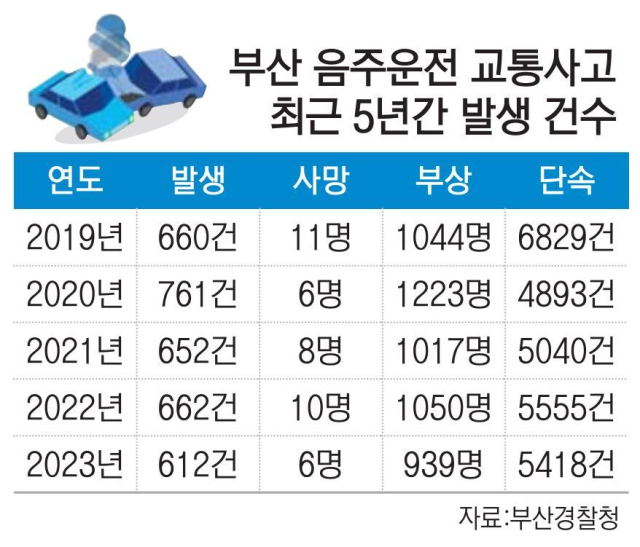 경찰에 따르면 지난 5년간 부산 시내 음주운전 사고 건수는 소폭 감소 추세다. △2019년 660건 △2020년 761건 △2021년 652건 △2022년 662건 △2023년 612건 등으로 나타났다.