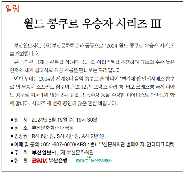 부산일보사는 (재)부산문화회관과 공동으로 '2024 월드 콩쿠르 우승자 시리즈'를 개최합니다.