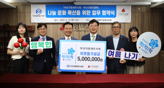 지난 13일 부산사랑의열매 사무국에서 진행된 협약식에는 부산지방세무사회 황인재 회장, 김삼현 부회장, 권혜진 홍보이사와 부산사랑의열매 최금식 회장이 참석했다.