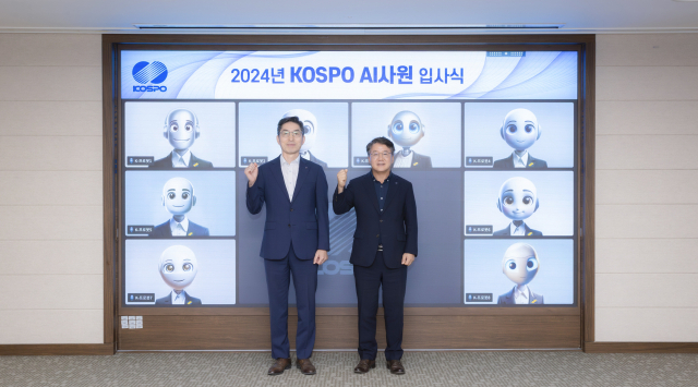이승우 한국남부발전 사장(오른쪽)이 ‘2024년 AI사원 입사식’ 기념 촬영을 하고 있다. 남부발전 제공