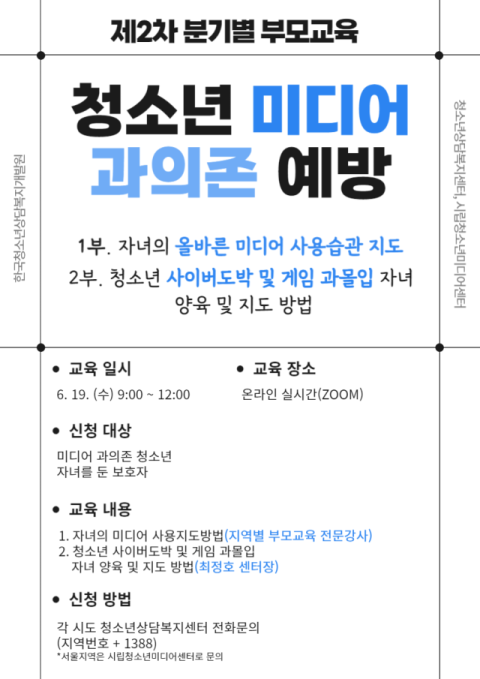 미디어 사용 관리 및 사이버 도박 중독 예방 방법 등 2종 교육 예정 6월 19일(수) 실시간 온라인 교육 진행