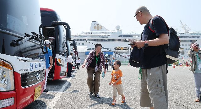 부산항국제여객터미널에 입항한 중국 상하이발 크루즈선 ‘블루 드림 멜로디호’에서 내린 중국 단체 관광객들이 시내 관광을 위해 버스에 탑승하고 있는 모습. 부산일보DB