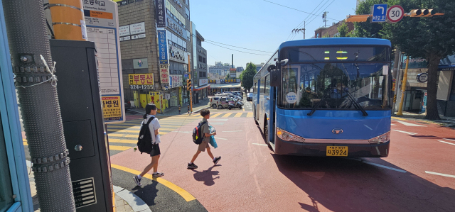 부산 사상구 엄궁동 한 초등학교 학생들이 교차로에 설치된 정류장에서 버스에 탑승하고 있다.