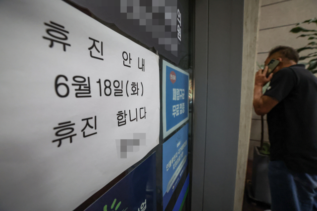 서울대병원에 이어 전국 병의원이 집단 휴진에 돌입한 18일 부산의 한 동네의원에 휴진 안내문이 붙어 있다. 김종진 기자 kjj1761@