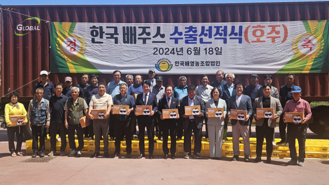 한국배영농조합법인은 18일 배 주스 호주 첫 수출 선적식을 가졌다. 김현우 기자