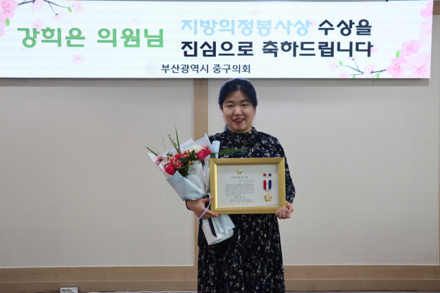 부산 중구의회 강희은 의원은 지난 14일 부산 자유회관 대강당에서 열린 ‘2024년 상반기 지방의정봉사상 시상식’에서 성실한 의정 활동을 펼친 공로를 인정받아 부산시구군의회의장협의회의 지방의정봉사상을 받았다.