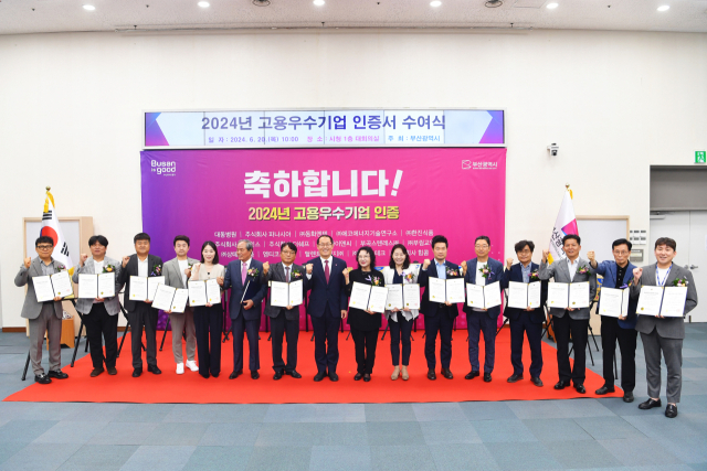 20일 부산시·부산경제진흥원은 금리, 고물가 등 어려운 경제 상황에서도 일자리 창출을 위해 노력한 15개사를 '2024년도 고용우수기업'으로 선정, 이날 시청 대회의실에서 인증서 수여식(사진)을 개최했다고 밝혔다.