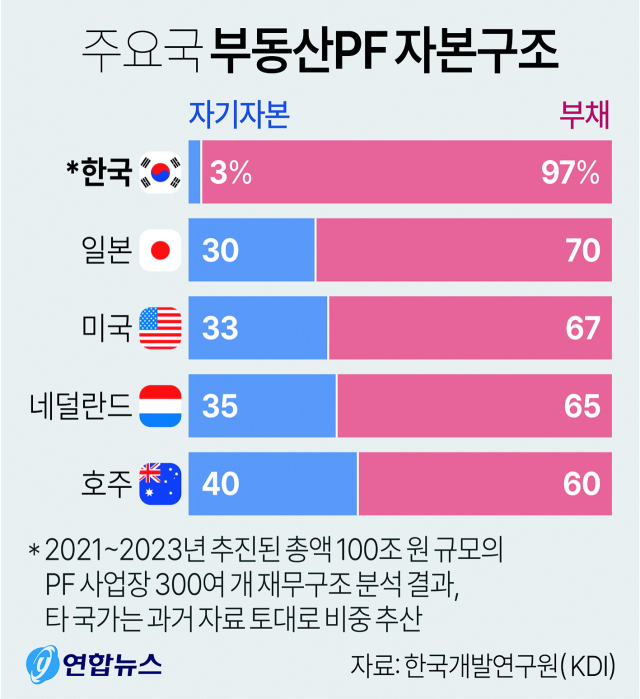 이에 대해 KDI는 “근본원인은 자기자본은 낮고 보증은 높은데 있다”고 진단했다. 사업주체인 시행사는 총 사업비의 3%에 불과한 돈을 투입하고 나머지 97%는 빚을 낸다.