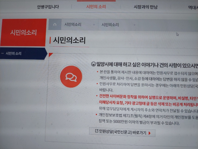 경남 밀양시청 홈페이지에 마련된 '시민의 소리' 코너.