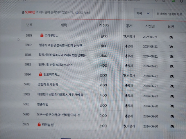 경남 밀양시청 홈페이지 '시민의 소리' 코너에 올라온 네티즌들의 의견.