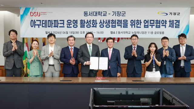 동서대학교(총장 장제국)와 기장군청(군수 정종복)은 지난 18일 뉴밀레니엄관 글로벌룸에서 ‘야구테마파크 운영 활성화 상생협력을 위한 업무협약’을 체결했다. 동서대 제공