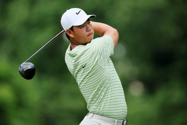 김주형이 23일(한국시간) PGA 트래블러스 챔피언십 3라운드에서 티샷을 날리고 있다. AFP연합뉴스