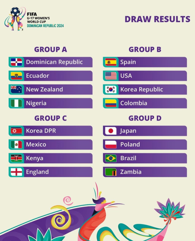 FIFA는 23일(한국시간) 도미니카공화국의 산토도밍고에서 2024 FIFA U-17 여자월드컵 조 추첨 행사를 열고 결과를 발표했다.