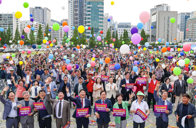 21일 오후 부산 남구 문현동 부산국제금융센터(BIFC) 공터에서 산업은행 이전 촉구 궐기대회가 열려 부산 남구 주민들이 주축이 된 한국산업은행 유치 기원 추진위원회와 참석 내빈들이 소망풍선 날리기 퍼포먼스를 하고 있다.
