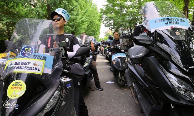민주노총 공공운수노조 라이더유니온지부 조합원들이 지난 21일 규탄대회를 열었다. 연합뉴스