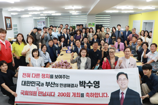 박 의원은 지난 22일 부산 남구 대연동 자신의 지역 사무실에서 주민을 만나 현장에서 직접 민원을 듣고 해결하는 ‘국쫌만’을 진행했다. 이후 박 의원과 기초, 광역 의원 그리고 사무실 관계자 등은 200회 축하 행사를 가졌다.