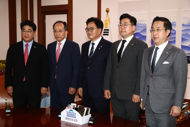우원식 국회의장이 21일 오후 국회의장실에서 원 구성을 위한 양당 원내대표 회동에서 기념 촬영하고 있다. 왼쪽부터 국민의힘 배준영 원내수석부대표·추경호 원내대표, 우원식 의장, 더불어민주당 박찬대 원내대표·박성준 원내수석부대표. 공동취재단 제공
