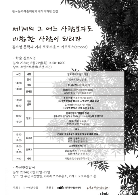 김수영연구회(회장 이민호)가 주최하고 부산작가회의(회장 김요아킴)가 후원하는 김수영 학술 심포지움이 27일 오후 2~6시 서면 소민아트센터에서 열린다. 이민호 연구회 회장의 ‘김수영 문학과 장소성’ 사업 관련 경과보고 후에 이영준 한국연구원 원장이 ‘김수영 문학과 거제 포로수용소’를 주제로 기조발표를 한다. 그밖에도 권박 동국대 교수가 ‘한국전쟁과 김일성 만세-김수영이 쓴 시 김일성 만세를 중심으로’, 임동확 한신대 교수가 ‘거제도 포로수용소 체험과 역설적 세계 인식’, 노혜경 시인이 ‘김수영에게 부산은’이라는 주제로 발표한다. 김수영연구회는 옛 부산 서전병원, 거제리 포로수용소, 거제도 포로수용소 등을 둘러보는 부산 현장답사를 28~29일 진행다.