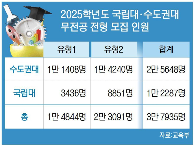 교육부는 2025학년도 대입부터 국립대와 수도권 지역 대학을 중심으로 무전공 전형 확대를 추진했다. 무전공 선발 비율을 대학 성과평가 결과에 반영하기로 하면서 국립대와 수도권 대학들은 무전공 전형 선발 인원을 확 늘렸다.