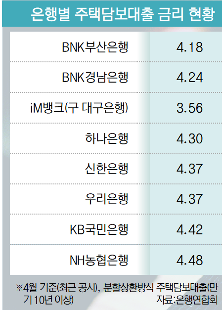 24일 은행연합회 공시에 따르면 지난 4월 BNK부산은행 주택담보대출(분할상환방식 만기 10년) 금리는 4.18%로 5대 시중은행(국민,농협,신한,우리,하나)이 4.3%~4.48%를 기록한 것과 비교하면 최대 0.3% 낮았다. 옛 대구은행인 iM뱅크는 3.56%로 지역은행 가운데 금리가 가장 낮았다. 경남은행은 4.24%로 부산은행보다는 높았지만 일부 시중은행과 비슷하거나 낮았다. 시중은행의 경우 농협이 4.48%로 가장 높았다. 국민은행이 4.42%, 신한은행·우리은행이 각각 4.37%, 하나은행이 4.3%를 기록했다.