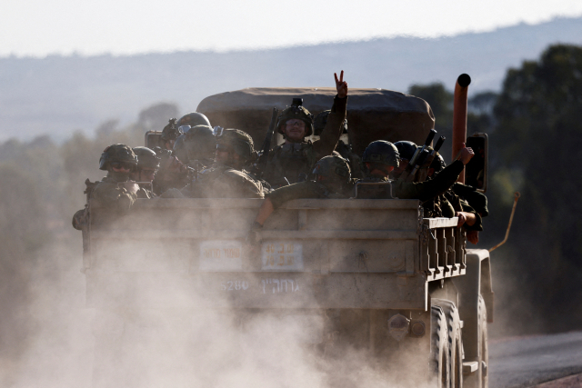 24일(현지시간) 가자지구 국경 근처에서 이스라엘 군인들을 태운 트럭이 지나는 가운데 한 군인이 손짓하고 있다. 로이터연합뉴스