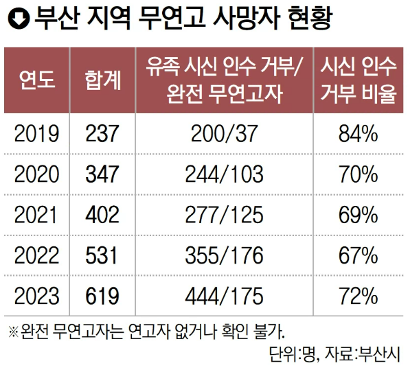 <부산일보>가 부산시에 요청해 받은 ‘부산 지역 무연고 사망자 현황’에 따르면, 무연고 사망자는 2019년 237명에서 2023년 619명으로 4년 동안 3배 가까이 늘었다. 무연고 사망자 수가 급증하고 있다는 점 못지 않게 눈여겨봐야 할 점은 유족들의 시신 인수 거부 비율로, 5년간 평균 71%에 달한다. 무연고 사망자 10명 중 7명 이상이 가족이 있음에도 무연고자로 처리돼 외로운 죽음을 맞이했다. 이는 가족 관계가 갈수록 느슨해지고 단절되면서 소득과 연령, 계층을 불문하고 누구든지 무연고자가 될 수 있음을 보여준다. 실제로 저소득층과 취약 계층의 문제로만 여겨졌던 무연사 문제는 다양한 계층으로 확산되고 있다. 결혼을 하지 않고 아이를 낳지 않은 사람, 불의의 사고로 가족을 잃고 홀로 남은 사람, 가족 관계에서 소외되거나 단절된 사람, 이민이나 유학 등으로 가족과 멀리 떨어져 있는 사람 등 가족의 해체와 1인 가구 증가 속에 무연고자가 되는 경로는 더욱 다양해지고 있다.