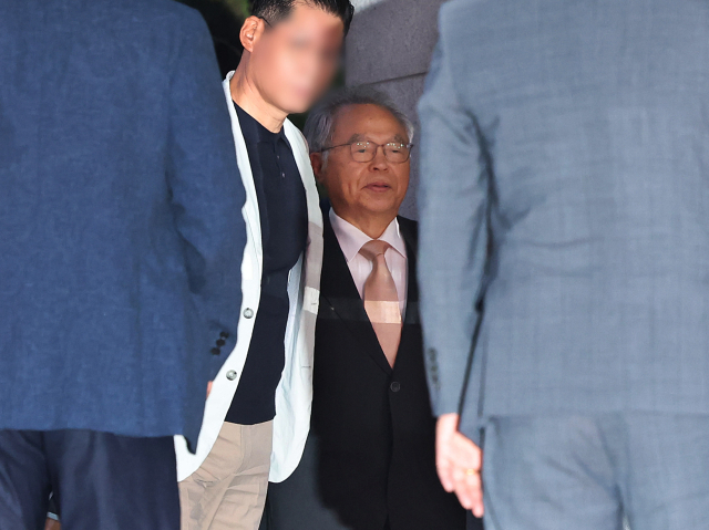 취재진 질문에 수행원에게 손목 이끌려 빠져나가