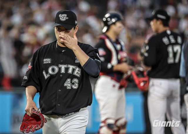 롯데 자이언츠 선발 나균안이 지난 25일 KIA 타이거즈와 시즌 9차전에서 1과 3분의 2이닝 8실점 한 뒤 강판되고 있다. 롯데 자이언츠 제공