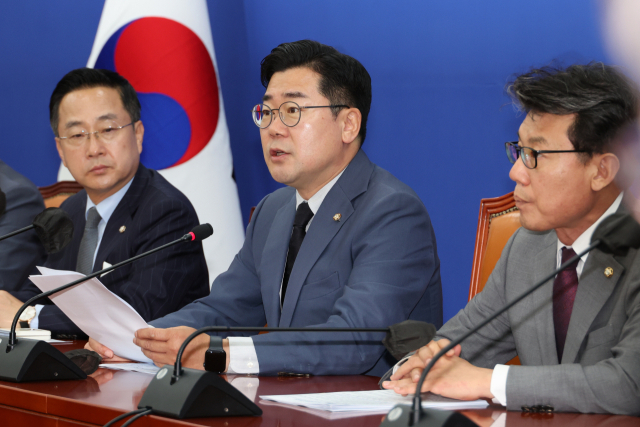 더불어민주당 박찬대 대표 직무대행 겸 원내대표가 27일 오전 서울 여의도 국회에서 열린 정책조정회의에서 발언하고 있다. 연합뉴스