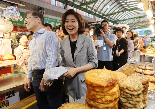 국민의힘 나경원 대표 후보가 30일 서울 광장시장을 방문해 둘러보고 있다. 연합뉴스