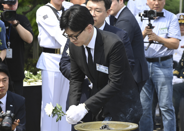 지난달 29일 오전 경기도 평택시 해군 제2함대사령부에서 열린 '제2연평해전 승전 22주년 기념식'에서 국민의힘 당권주자인 한동훈 전 비상대책위원장이 헌화하고 있다. 연합뉴스