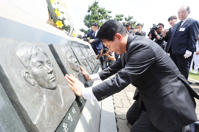 지난달 29일 오전 경기도 평택시 해군 제2함대사령부에서 열린 '제2연평해전 승전 22주년 기념식'에서 국민의힘 당권주자인 원희룡 전 국토교통부 장관이 해전 영웅들의 얼굴 부조상을 어루만지고 있다. 연합뉴스