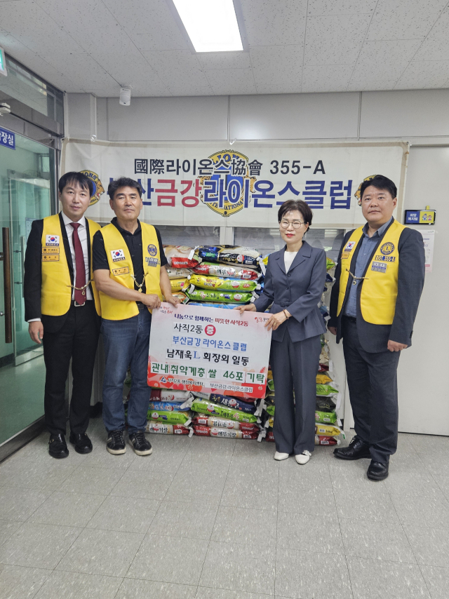 부산금강라이온스클럽(회장 남재욱)은 지난달 25일 동래구 사직2동(동장 김현자)에 회장 이·취임식 ㅌ화환으로 받은 백미 10kg 46포를 기탁했다.