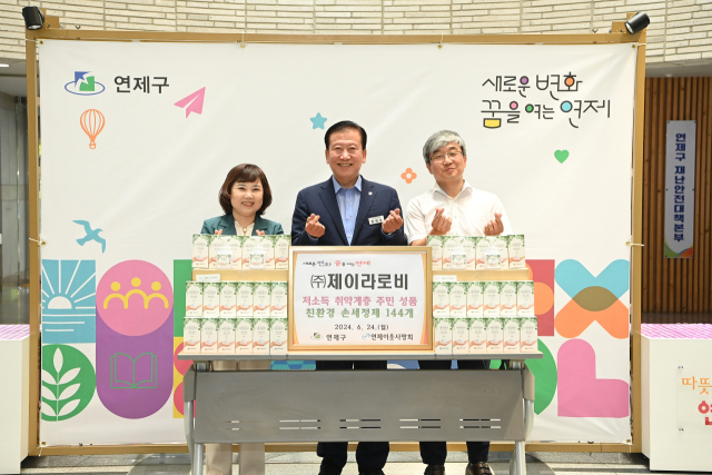 부산 연제구(구청장 주석수)는 지난달 24일 (주)제이라로비(대표 김종달)로부터 친환경 손세정제 144개를 기탁받아 사회복지시설에 전달했다.