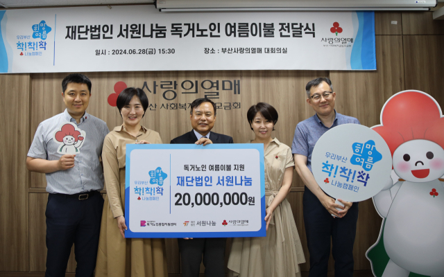 재단법인 서원나눔(이사장 강수자)은 지난달 28일 부산 지역 저소득 홀몸 어르신 가정에 시원한 여름을 보낼 수 있도록 성금 2000만 원을 부산사회복지공동모금회(부산사랑의열매·회장 최금식)에 전달했다.