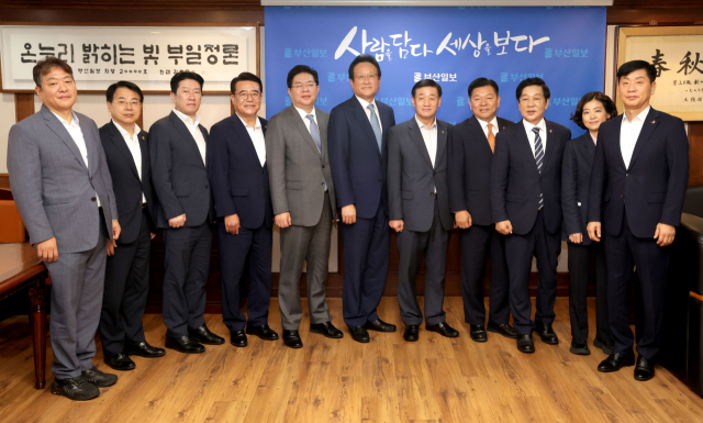 제9대 후반기 부산시의회 의장단이 3일 부산일보를 방문했다. 왼쪽부터 성창용 기획재경위원장, 윤일현 교육위원장, 송상조 행정문화위원장, 이종환 제2부의장, 안성민 의장, 김진수 부산일보 사장, 이대석 제1부의장, 강철호 운영위원장, 최도석 해양도시안전위원장, 김효정 윤리특별위원장, 김재운 건설교통위원장.