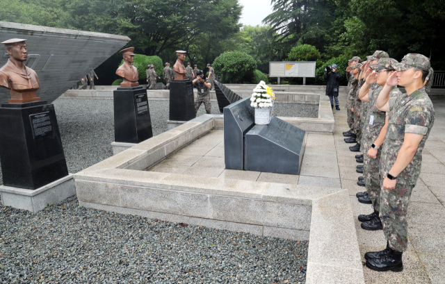 해군사관학교 생도들이 3일 오전 부산 중앙공원 내 대한해협전승비를 찾아 참배하고 있다. 대한해협해전은 해군 백두산함이 1950년 6월 26일 새벽 부산 해상에서 북한군 무장 선박을 교전 끝에 격침한 전투로 대한민국 해군의 첫 승전으로 기록되고 있다.