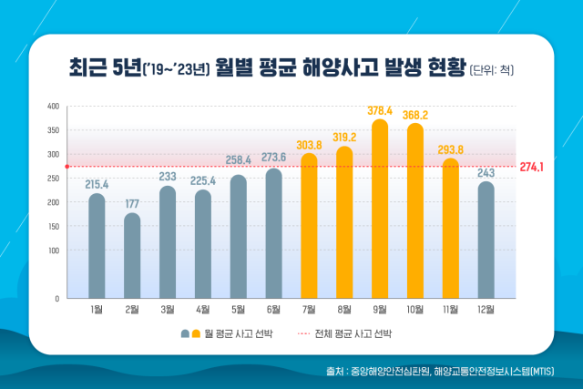 최근 5년(2019~2023년) 월별 평균 해양사고 발생 현황. KOMSA 제공