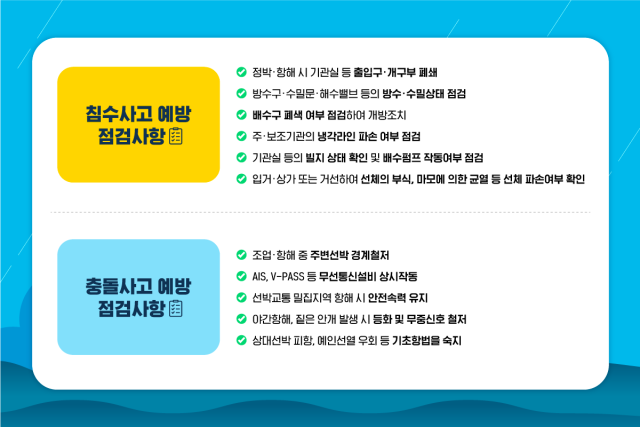집중호우 등으로 인한 침수사고 예방을 위해서는 △정박·항해 시 기관실 등 출입구·개구부 폐쇄 △배수펌프 작동여부 점검 △선체 파손여부 확인 등 급변하는 기상환경에 대응하기 위해 안전관리를 철저히 해야 한다. 또한, 선박 운항자는 기상악화로 인한 충돌사고에 대비해 △조업·항해 중 주변 선박 경계철저 △AIS, V-PASS 등 무선통신설비 상시작동 확인 △야간항해, 짙은 안개 발생 시 등화 및 무중 신호 철저 등 기초항법을 숙지하고 안전수칙을 지켜야 한다. 무중 신호란 선박에서 보내는 주의 신호로, 안개나 눈 등으로 앞이 보이지 않을 때 기적이나 종 따위로 소리를 내어 배의 위치나 움직임을 알리는 신호를 말한다.