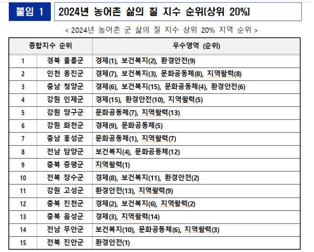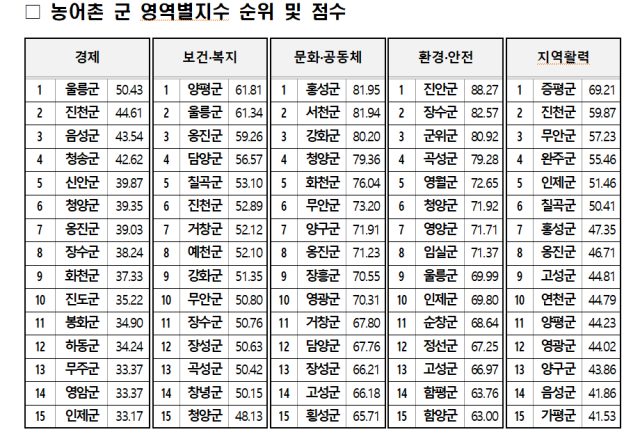 농어촌 군 지역의 영역별 우수 지자체로 △경제는 울릉군(50.73점), 진천군(44.61점), 음성군(43.54점) 순이고 △보건·복지는 양평군(61.81점), 울릉군(61.34점), 옹진군(59.26점) 순이었다. 또한 △문화·공동체는 홍성군(81.95점), 서천군(81.94점), 강화군(80.20점) 순이고 △환경·안전은 진안군(88.27점), 장수군(82.57점), 군위군(80.92점) 순, △지역활력은 증평군(69.21점), 진천군(59.87점), 무안군(57.23점) 순으로 나타났다.