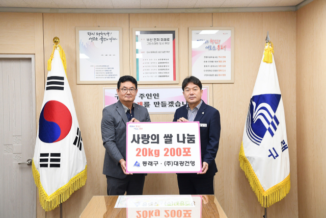 (주)대광건영(대표 김남중)은 최근 부산 동래구(구청장 장준용)에 쌀 화환으로 받은 백미 20kg 200포(940만 원 상당)를 기탁했다.