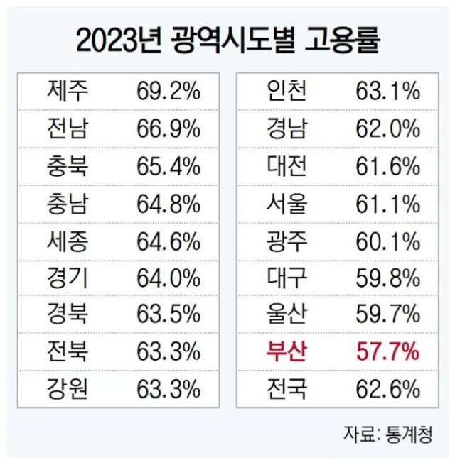 부산 고용률 17년째 꼴찌… 타 지역과 임금 격차 심화