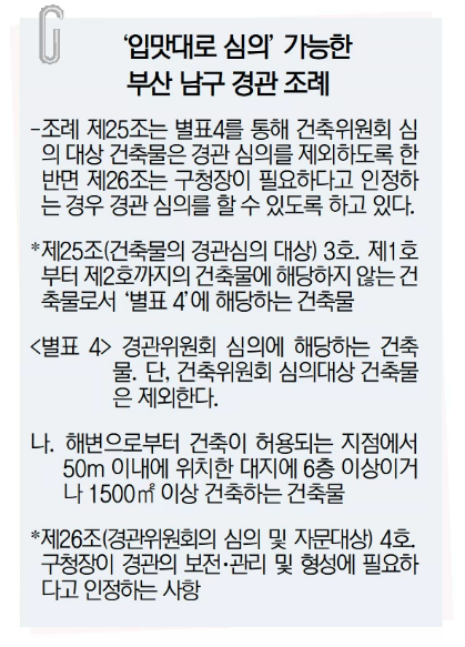 부산 남구청은 7일 아이에스동서가 이기대 앞에 짓는 아파트의 경우 시 경관 조례 제25조 4호에 따라 경관 심의 대상이라고 밝혔다. 그러나 아이에스동서 아파트는 인허가 과정에서 경관위원회 심의를 거치지 않았다. ‘건축위원회 심의 대상 건축물은 제외한다’는 같은 조례 ‘별표5’에 담긴 예외 규정 때문이다. 해당 아파트의 경우 시가 지난 2월 단 한 차례 개최한 통합심의에서 건축 심의가 함께 이뤄졌다는 이유로 제대로 된 이기대 경관 보존 논의가 이뤄지지 않은 채 인허가 과정을 밟고 있다.