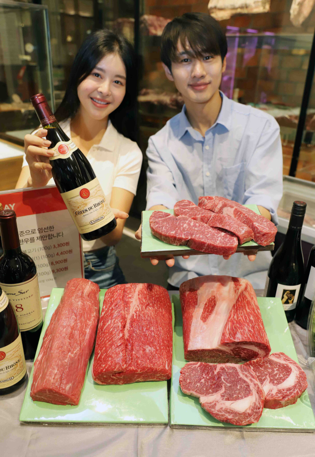 신세계백화점이 오는 11일까지 전 지점에서 ‘신세계 암소 데이’를 진행한다. 모델들이 한우 인기 부위와 와인 등 ‘신세계 암소 데이’ 상품을 선보이고 있다. 신세계백화점 제공