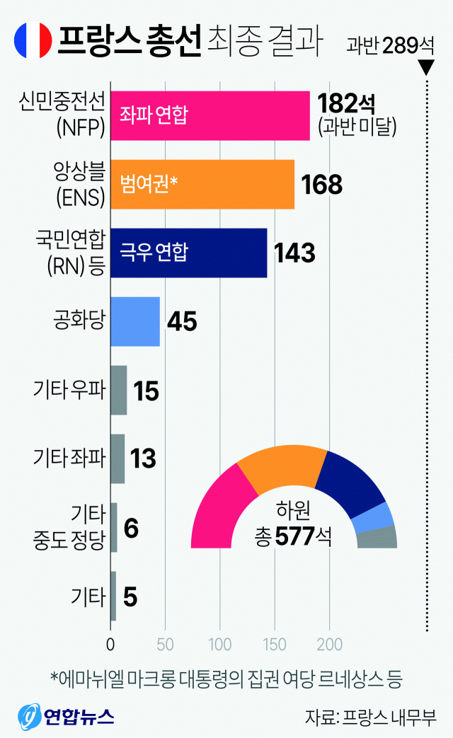 8일 프랑스 내무부의 발표에 따르면 이번 총선 결과 좌파 연합은 전체 하원 의석 577석 중 182석을 차지해 1당에 올랐다. 1차 투표에서 참담한 성적을 냈던 마크롱 대통령의 범여권이 168석을 얻어 2위가 됐다. RN과 그 연대 세력은 143석에 그쳐 3위에 머물렀다. RN과 연대하지 않은 우파 공화당은 45석, 기타 우파 15석, 기타 좌파 13석, 기타 중도 정당 6석, 지역주의 세력 4석, 기타 정당 1석 등으로 최종 집계됐다. 지난달 30일 치러진 1차 투표 결과를 토대로 극우 정당이 의회 다수당을 차지할 거란 예측이 나왔으나 2차 투표에서 판세가 완전히 뒤집힌 셈이다.