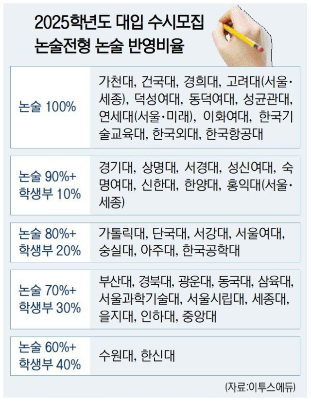 논술전형을 실시하는 대학들은 대부분 논술 결과 100%를 바탕으로 신입생을 뽑는다. 서울·수도권 대학 상위권 대학이 거의 해당한다. 건국대와 경희대, 고려대, 성균관대, 연세대, 이화여대, 한국외대는 논술 반영 비율을 100% 적용한다. 한양대·홍익대·숙명여대는 논술 90%+학생부 교과 10%, 서강대·단국대 등은 논술 80%+ 학생부 교과 20%를 적용한다. 부산대와 경북대, 동국대, 서울시립대는 논술 70%+학생부 교과 30%를 반영해 우수한 학생을 선발한다.