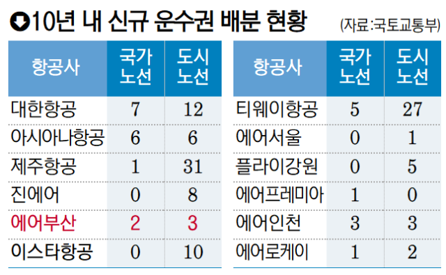 제주항공·티웨이 운수권 32개씩 늘 때 에어부산은 10년간 고작 5개만 늘었다