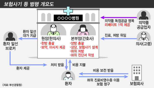 부산경찰청 형사기동대는 보험사기방지 특별법·의료법 위반, 허위진단서 작성 등의 혐의로 전문 한방병원장 50대 A 씨와 상담본부장 간호사 60대 B 씨를 구속 송치하고 고용된 전문의, 의약품업자와 환자 90여 명을 불구속 송치했다고 9일 밝혔다.